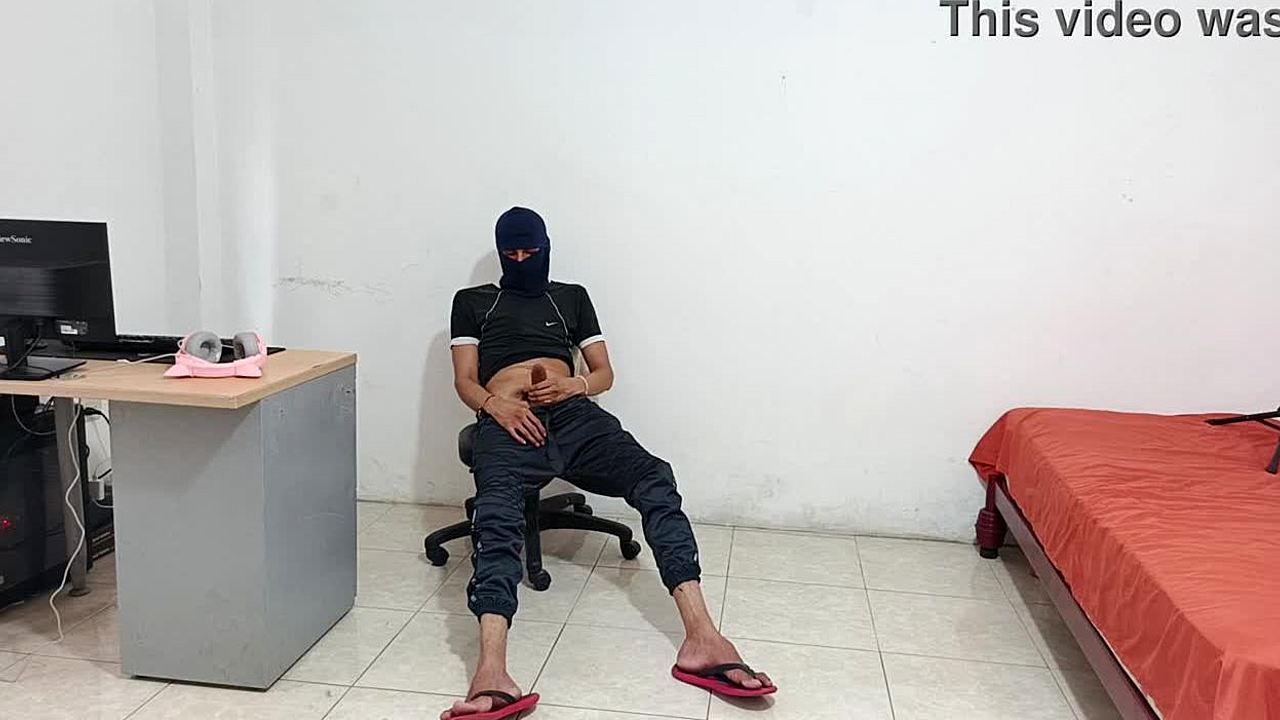 Young college student feels intense pleasure masturbating big cock to orgasm without hands